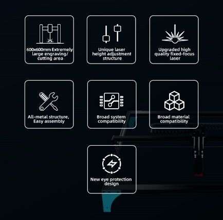 600x600mm Extremely large engraving/cutting area · Unique laser height adjustment structure